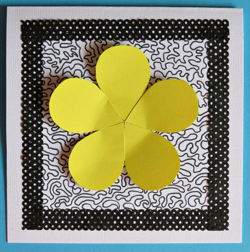 Cut 5 similar flower petals from the yellow cardstock. Glue the petals to the front of the card, but do not glue the petals down completely. Only add glue to the smaller sections of the petals so that you can curl back the bigger parts of the petals to create a 3D-effect.