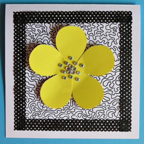 I love the contrast between the black and white on this card preparing it for any other bright color you'd like to add such as the yellow! I also really like the way that the two different black patterns...the squiggly lines and the circle shapes in the 15mm black lace tape hold a balanced tension between the inside of the square and the frame. The 5" by 5" card size and shape places the yellow flower in the center right in the middle as the focus point. The silver rhinestones in the middle of the flower and the black/white bow keeps it all grounded. Thanks for sharing!
