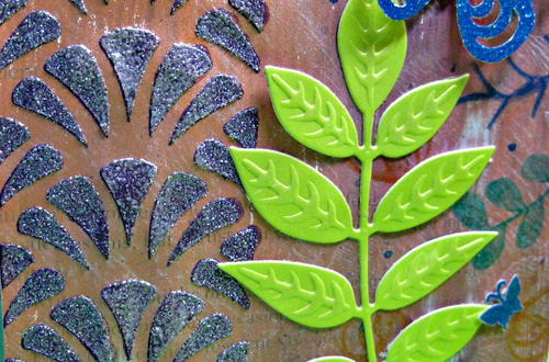 Remove the stencil and clean immediately. Let the mousse dry completely, then heat set the embossing powder with a heat gun for a sparkly dimensional finish to the stenciled mousse. It is hard to show the sparkle of the glitter markers and the embossed mousse, but here is a close up picture for you to see: -