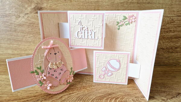 "I bought a gift for a new baby girl and decided to make a coordinating card. I made a floating pop up inside and used some simple shapes to make a little rabbit. You can see the entire process in my video The pop up mechanism is easy to make and can be adapted to have different shapes inside instead of the squares eg circles, hearts, flowers etc I had to be creative when it came to making the little rabbit as I didn't have any suitable dies or the right colour of card. I coloured the card with an alcohol marker and adapted some simple shapes. Thanks for looking :)"