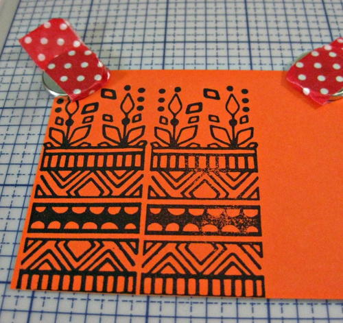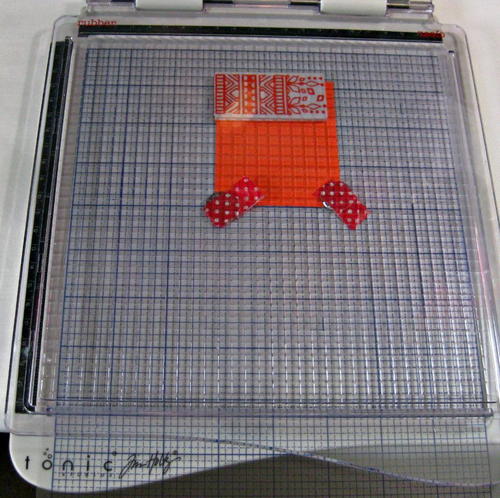 Cut a piece of orange cardstock 2 5/8” x 3 1/8” and place in the Tonic Tim Holtz Stamp Platform.