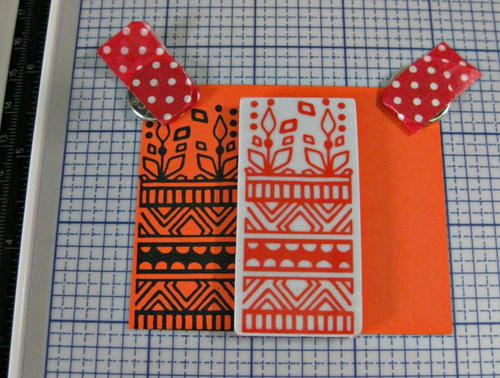 Choose the rubber side of the top of the stamp platform, and place the Henna Flourish stamp on the side of the orange piece. Close the platform so it picks up the stamp exactly where you want to stamp it and ink the stamp with black ink, then close the top of the stamp platform. If it is not stamped perfectly the first time, you can repeat this step as many times as necessary to get a perfect stamped image every time. Clean off the stamp, move it over and repeat. Cover the orange piece with the henna stamped lines, then die cut out the witch’s hat from the center top of the orange stamped piece.