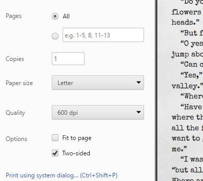 Two-Sided: Some printers allow you to choose whether you wish to print on one side of the paper or on both sides of the paper. Choose two-sided (or "print on both sides of paper") if you want Page 1 on one side and Page 2 on the other side. This would result in the free printable resembling an actual book page (only bigger). -