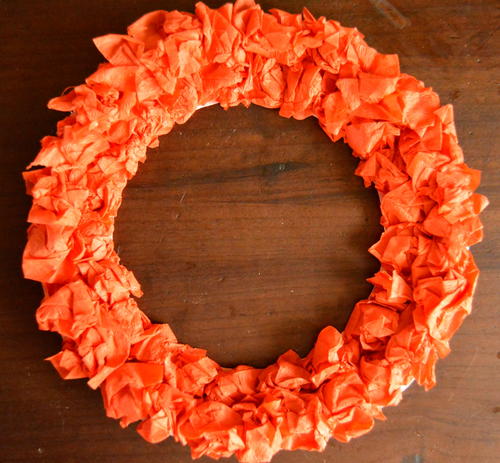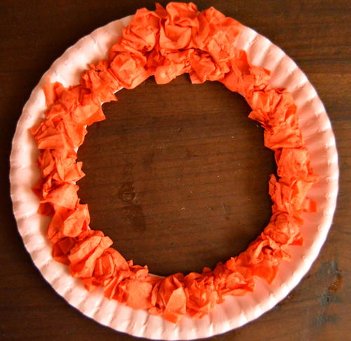 Cover the paper plate wreath with the orange crepe paper: Cut the crepe paper into 4" sized squares. Take a square and crumple it up. Use glue to affix it to the paper plate wreath. Continue adding crumpled pieces of crepe paper to the wreath until the whole wreath has been covered.