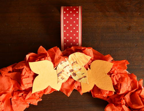 Trace and cut out 6 leaves from the pumpkin yellow cardstock and 3 from the brown cardstock. Glue the leaves onto the wreath.