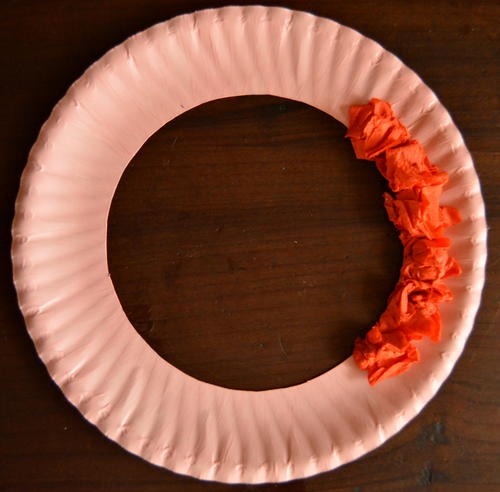 Cover the paper plate wreath with the orange crepe paper: Cut the crepe paper into 4" sized squares. Take a square and crumple it up. Use glue to affix it to the paper plate wreath. Continue adding crumpled pieces of crepe paper to the wreath until the whole wreath has been covered.