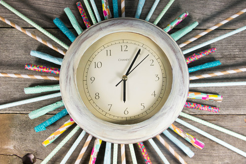 Hot glue the pieces, intermixed with the straws, around the back of the clock, creating a star-burst effect.